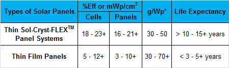 Thin Sol-Cryst-FLEXTM Panel Systems have a currently and rising much higher efficiency compared to thin film solar panels. This superior charging power is very stable and little affected by aging for over 10 years of sun and weather exposure (See Table 1), and also gives significant savings.
