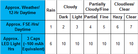 All daylight, sunny or cloudy, is converted to electricity by solar cells that can last for 2+ decades. The daylight electricity is charged to 3 super (battery) capacitors with a storage total of 100 mAh. They nominally have > 10,000 charge-discharge cycles, at 1 cycle per day, this would be 10k days or up to 27 years functional life expectancy.