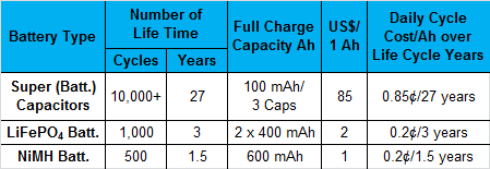 The higher initial cost per 1 Wh power storage of the over 25 year functional life of super (battery) capacitors and the solar generator system is recovered many times over by these savings: